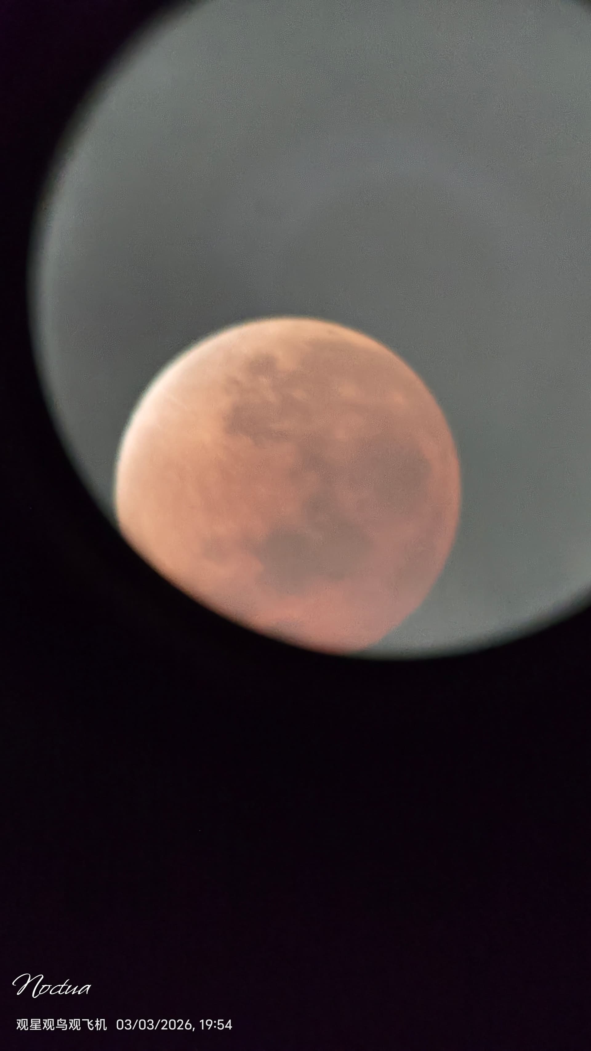 I used a huge telescope at our school astronomy club to get this photo. This was my first photo taken at a lunar eclipse.There are a lot of people watching the lunar eclipse at our school, and I made a lot of friends during the observation.