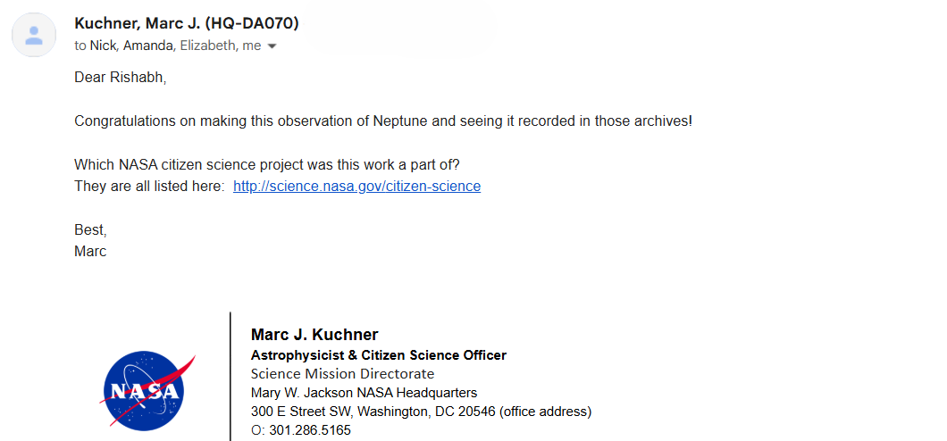 I am also honored that this observation has been appreciated by scientists associated with NASA and the Royal Astronomical Society. As a result of this work, I have received the opportunity to contribute to two NASA Citizen Science projects β Backyard Worlds: Planet 9 and Daily Minor Planet β under the guidance of NASA scientists. This milestone demonstrates how dedicated amateur astronomy, even from the heart of a bright city, can contribute meaningfully to the global scientific community.