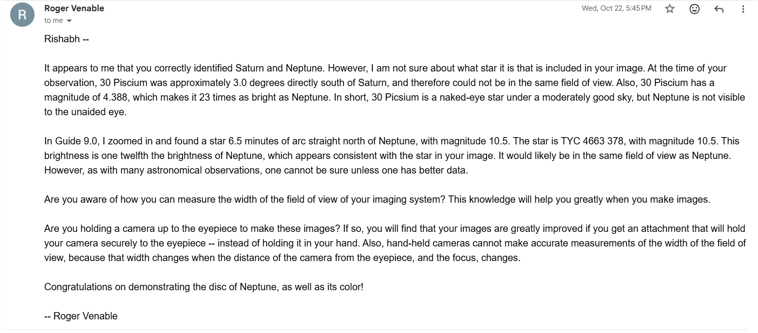 Hello Everyone, My Name is Rishabh Sagar. On the night of 4th September 2025, I conducted and successfully recorded one of the rarest visual observations of Neptune from the bright Bortle 9 skies of New Delhi. Using a 130mm Newtonian Reflector and a Svbony 7β21mm Zoom Eyepiece, I identified Neptune (magnitude ~7.8) alongside the nearby reference star TYC 4663β378 (magnitude ~10.8), and also observed Saturn during the same session. Despite severe urban light pollution, the faint bluish planetary disk of Neptune was distinctly discernible β not merely as a star-like point, but with visible color and resolved disk structure. Detecting both the color and the tiny ~2.3 arcsecond disk through a small 130mm aperture under heavy light pollution makes this one of the rarest visual Neptune observations achieved with modest amateur equipment.